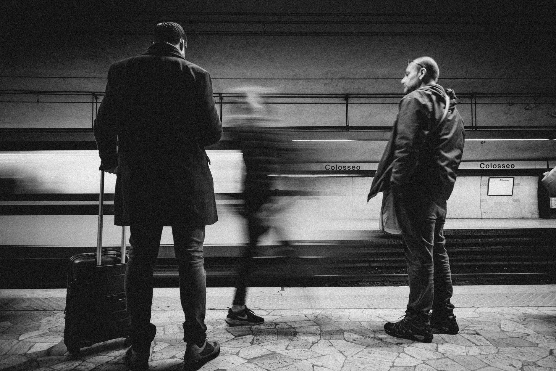 three person standing on infront of bullet train
