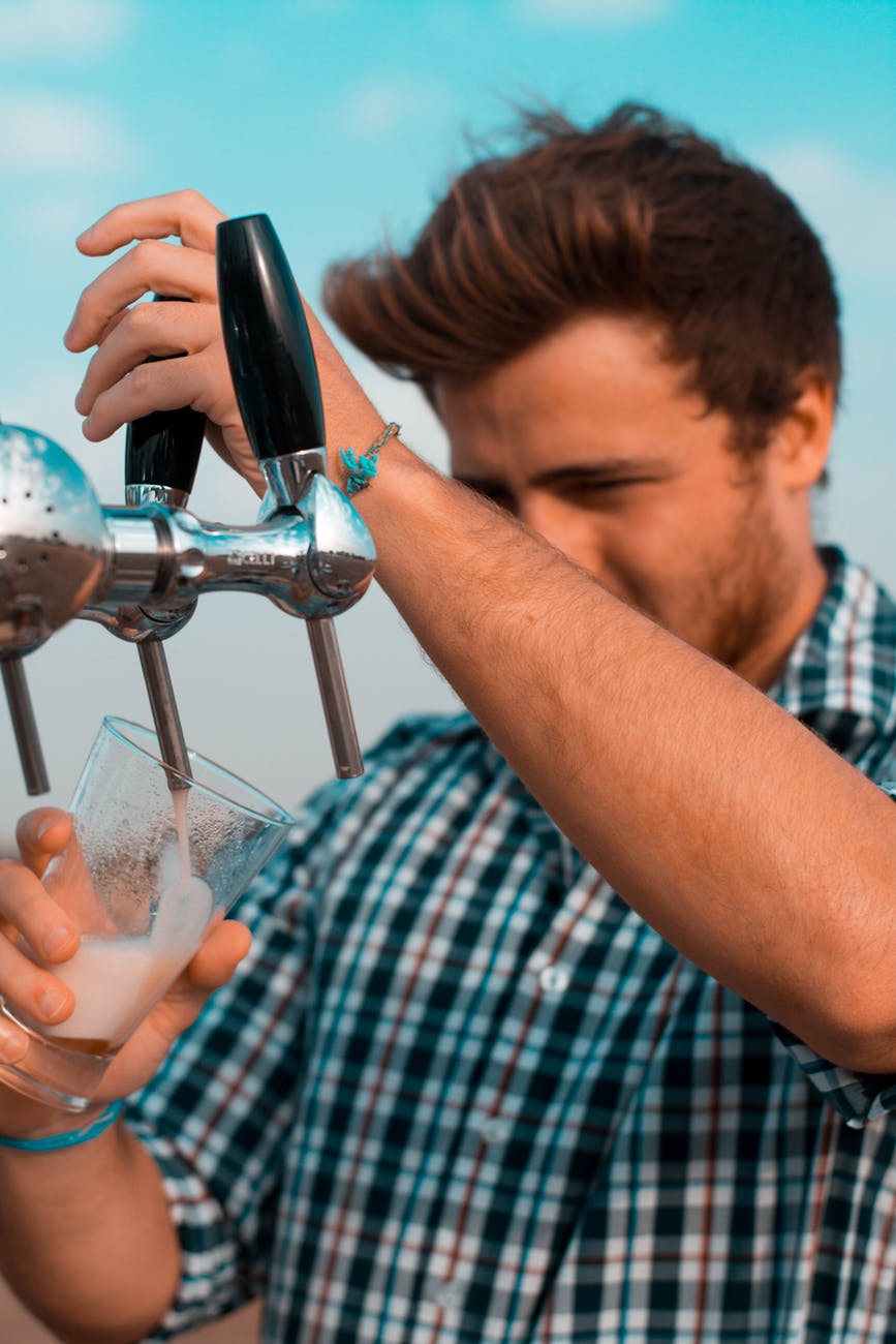 man holding black beer tap handle pouring beer on clear glass